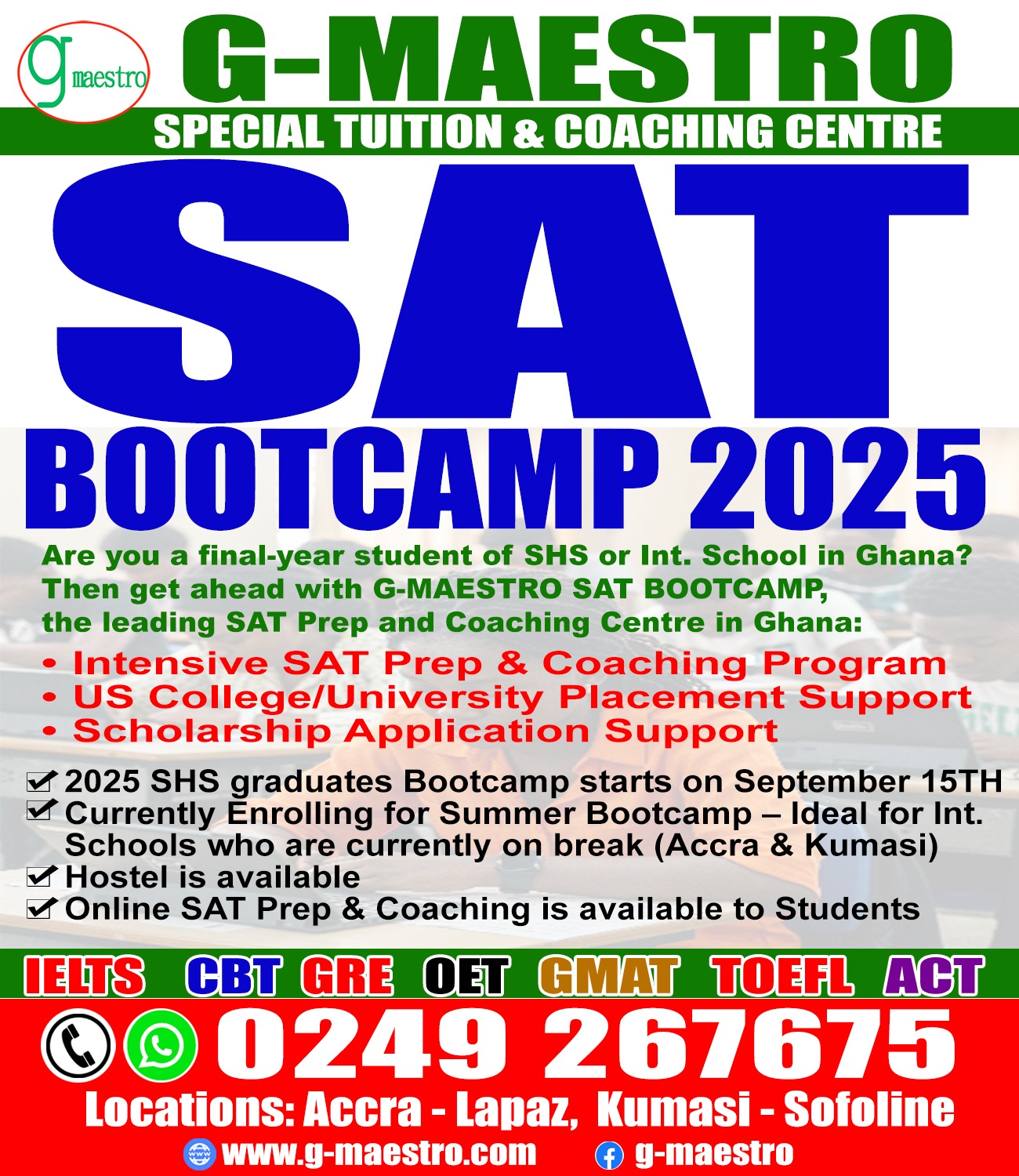 Then enroll at G-Maestro Centers (Accra, Kumasi or Online) to obtain the best Score for Scholarships, Admissions, and Visa Applications in UK, USA, Canada, Australia and other countries.